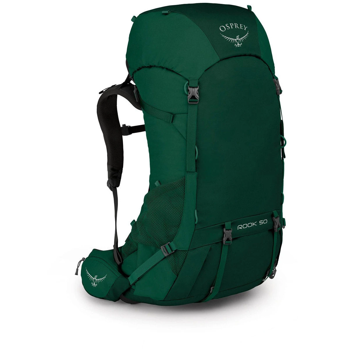Rook 50 liter men’s backpack is lightweight but built tough, for overnight and weekend trips, featuring adjustable harness and sleeping bag compartment.